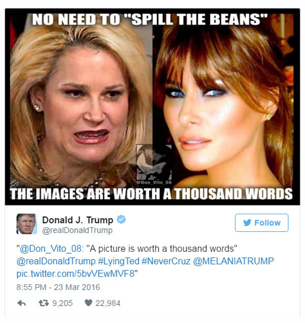 テッド・クルズの妻・ハイディのひどい映りの写真と、自分の妻・メラニアの映りのいい写真。この二つを並べてツイートしたのだ。「百聞は一見に如かず」という言葉とともに。